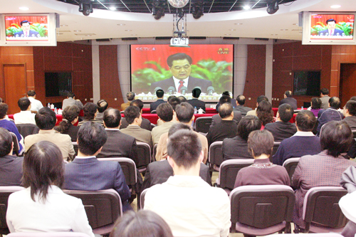 雖然因為人員太多而略顯擁擠,但整個會場卻非常安靜,就連每逢會議難免嗡嗡作響的手機似乎也絕了聲。大家都在認真地傾聽,有的詳細地做著記錄,有的還時不時地將身子輕輕探起,生怕錯過電視里傳出的只言片語……10月15日上午,中核集團公司黨組成員、副總經理孫又奇,黨組成員王森,以及老領導趙宏、李忠良、錢福源等與集團公司總部、檔案館、金原鈾業公司、新聞宣傳中心、二二一局的干部職工一起收看了中共十七大開幕式的現場直播,聆聽了胡錦濤總書記所作的報告。